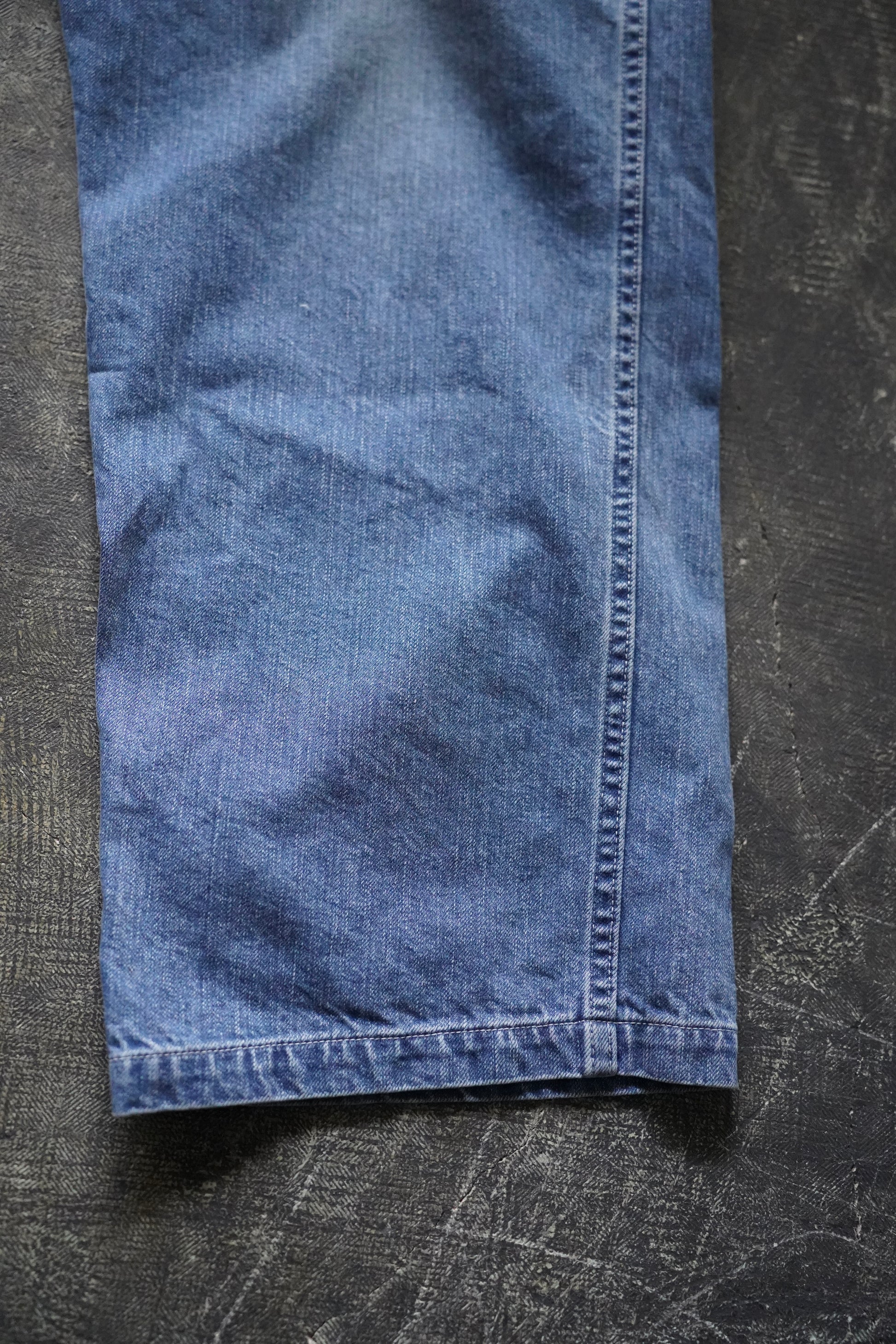 アメリカ海軍がデッキ作業用ユニフォームとして支給していた、デニムパンツのデザイン、仕様がモチーフ。ベイカーパンツのようなフロントポケット、大きなバックポケット、フロントボタンフライ仕様、ホワイトステッチなどが特徴です。生地は11.5ozのスビンコットン合成インディゴデニムを使用。また、防縮加工や毛焼きといった整理加工を施していない、生機(きばた)デニム。それを熟練した縫製技術で仕上げることで、デニム本来の表情を存分に引き出しました。岡山で1966年の創業以来、三代にわたってカジュアルウェアを縫製してきた縫製工場を背景に持つ、CIOTAならではアイテムです。