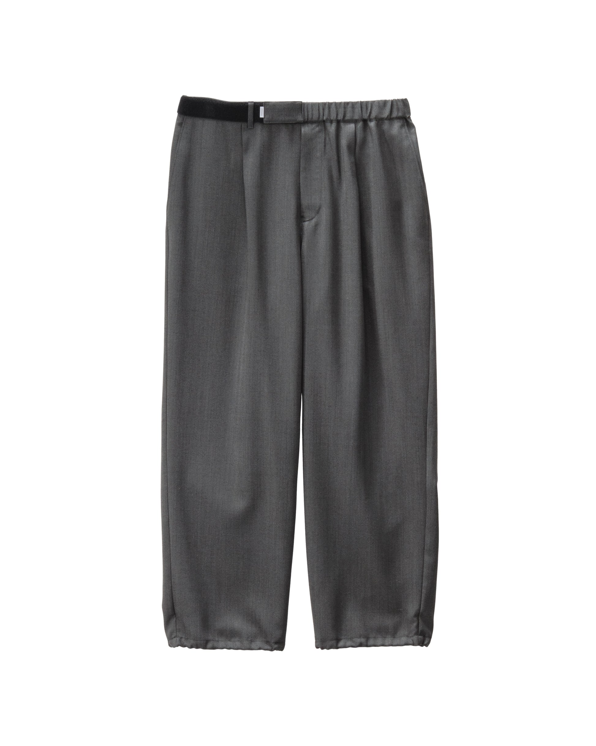 80’sの空気感を纏う、存在感あるヘリンボンのシェフトラックパンツ。膨らみのあるウール糸とポリエステルを撚糸することで、ジャガードのような立体感とシャープな綾畝を両立、そして手触りにも訴える無骨な質感が特徴です。クラシックな素材感に対し、裾のスピンドルでシルエットを自在に操れるギミックを搭載。アーカイブの薫りと現代的な機能性が共存しスタイルに深みを与える一着に。