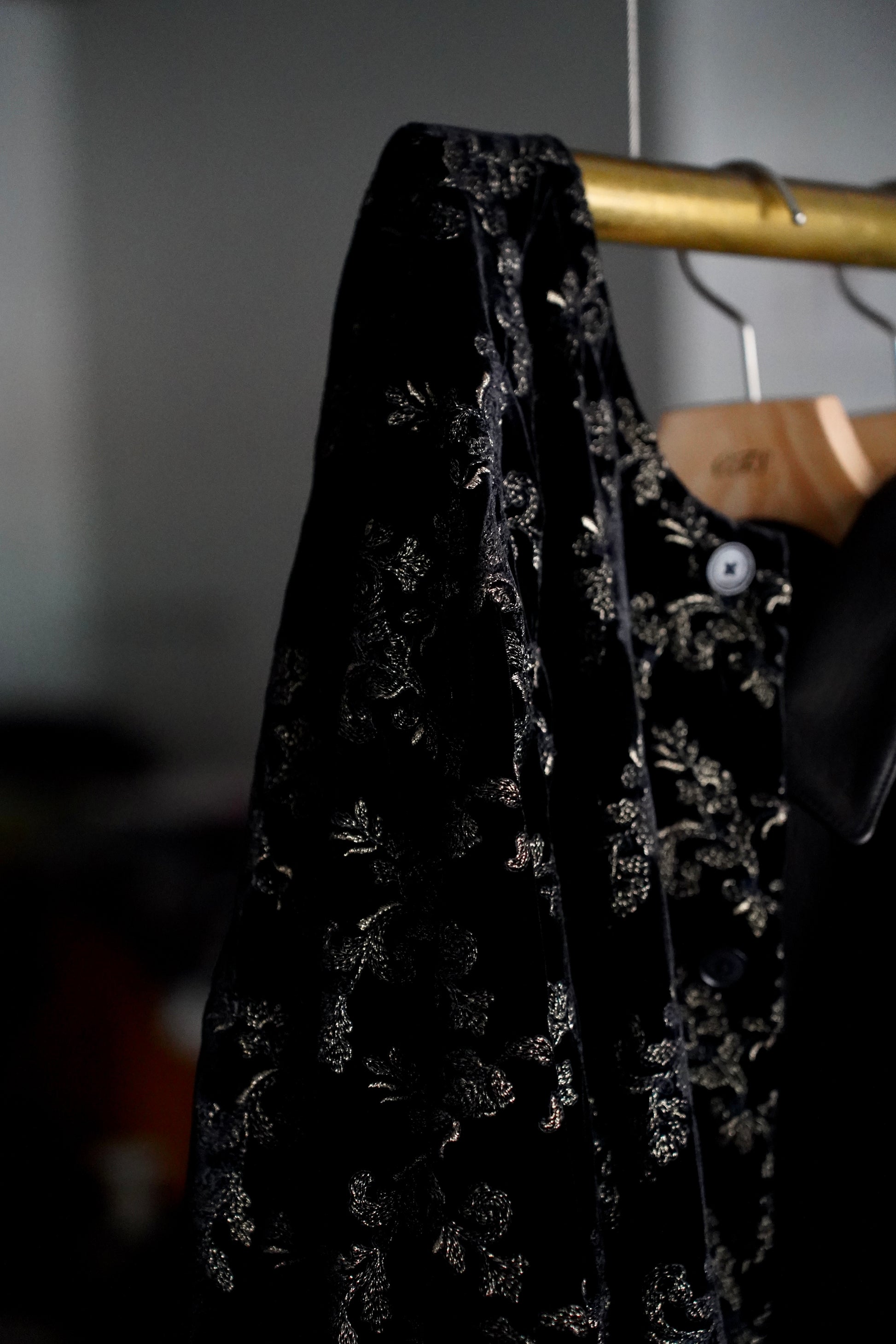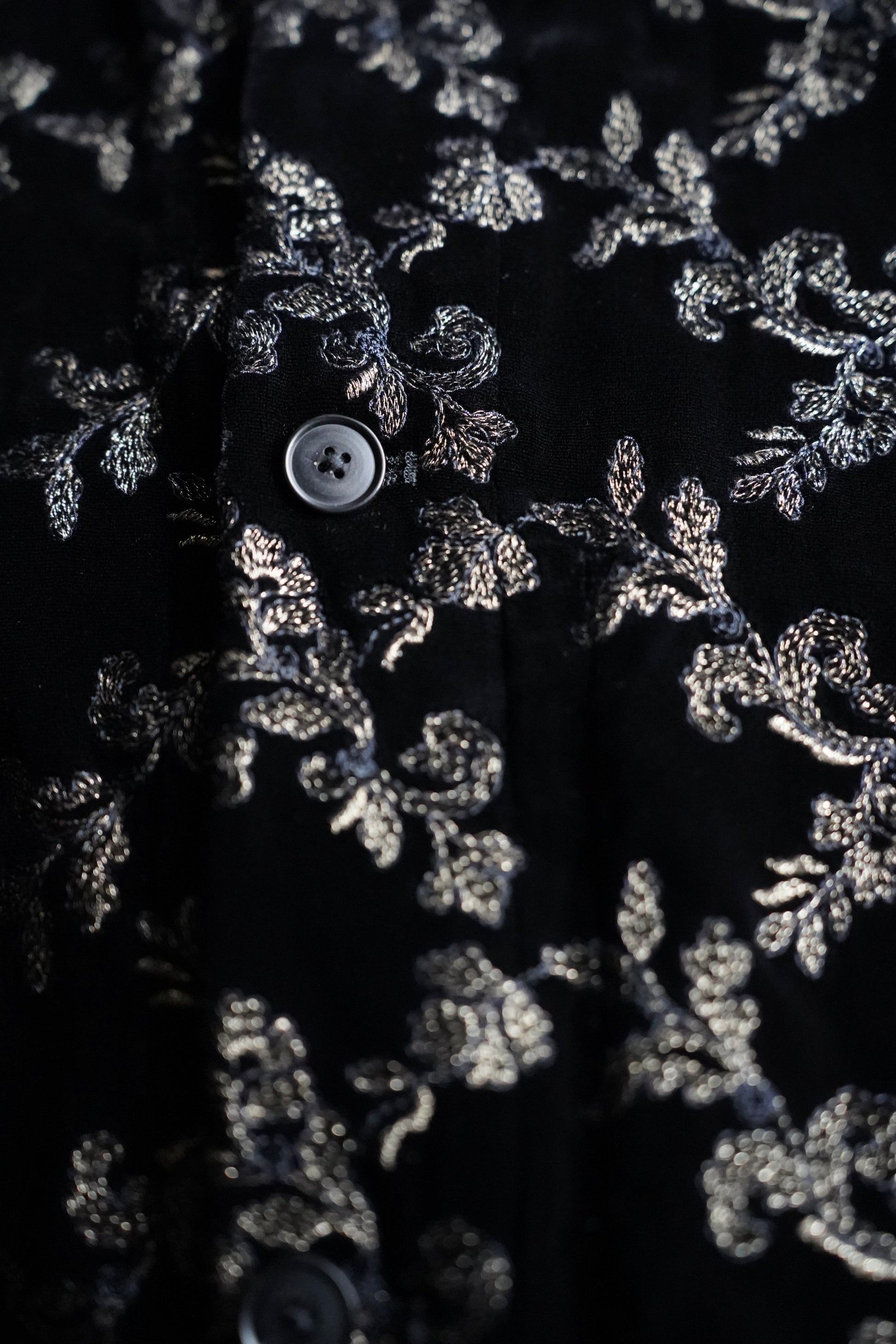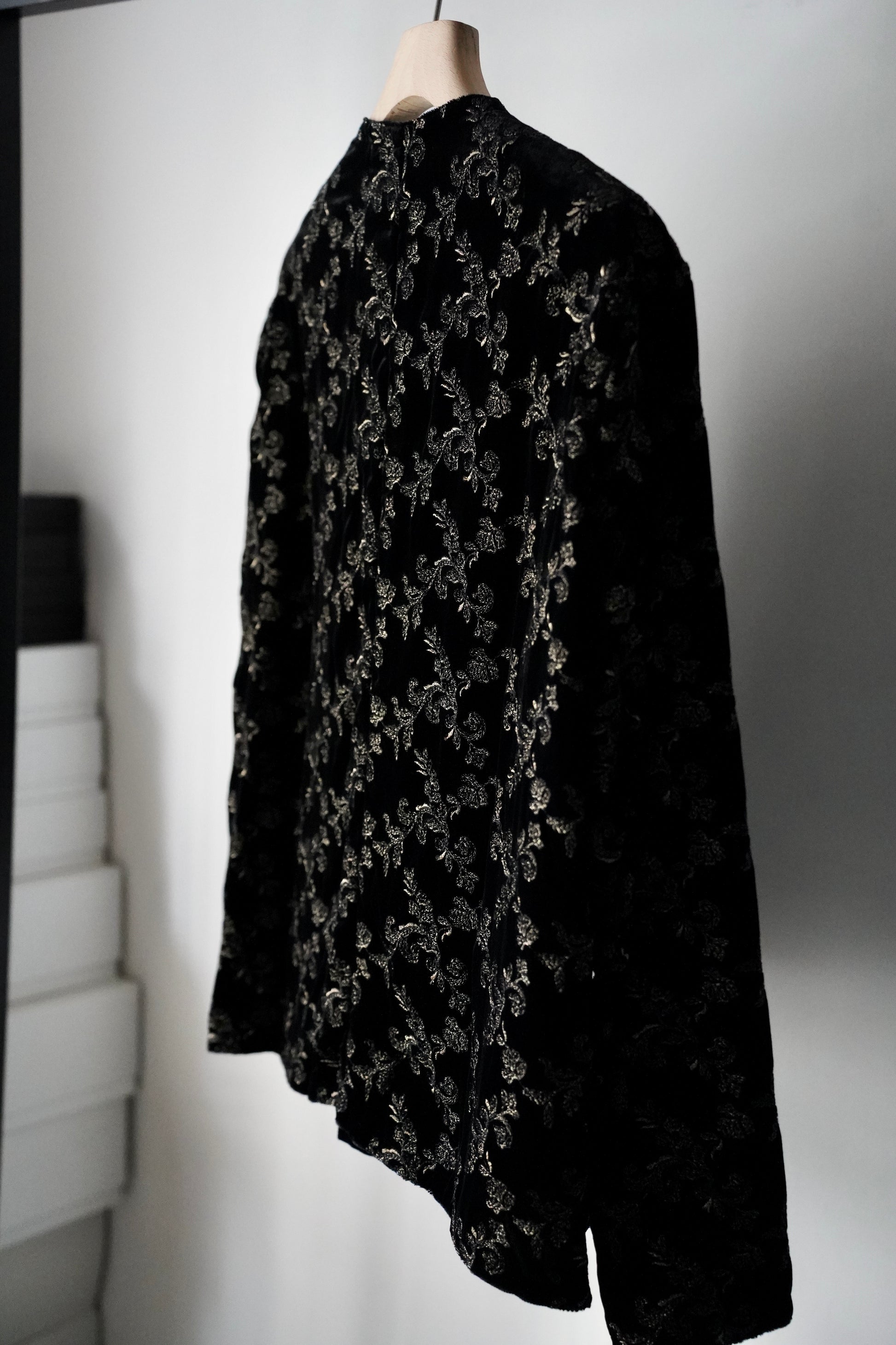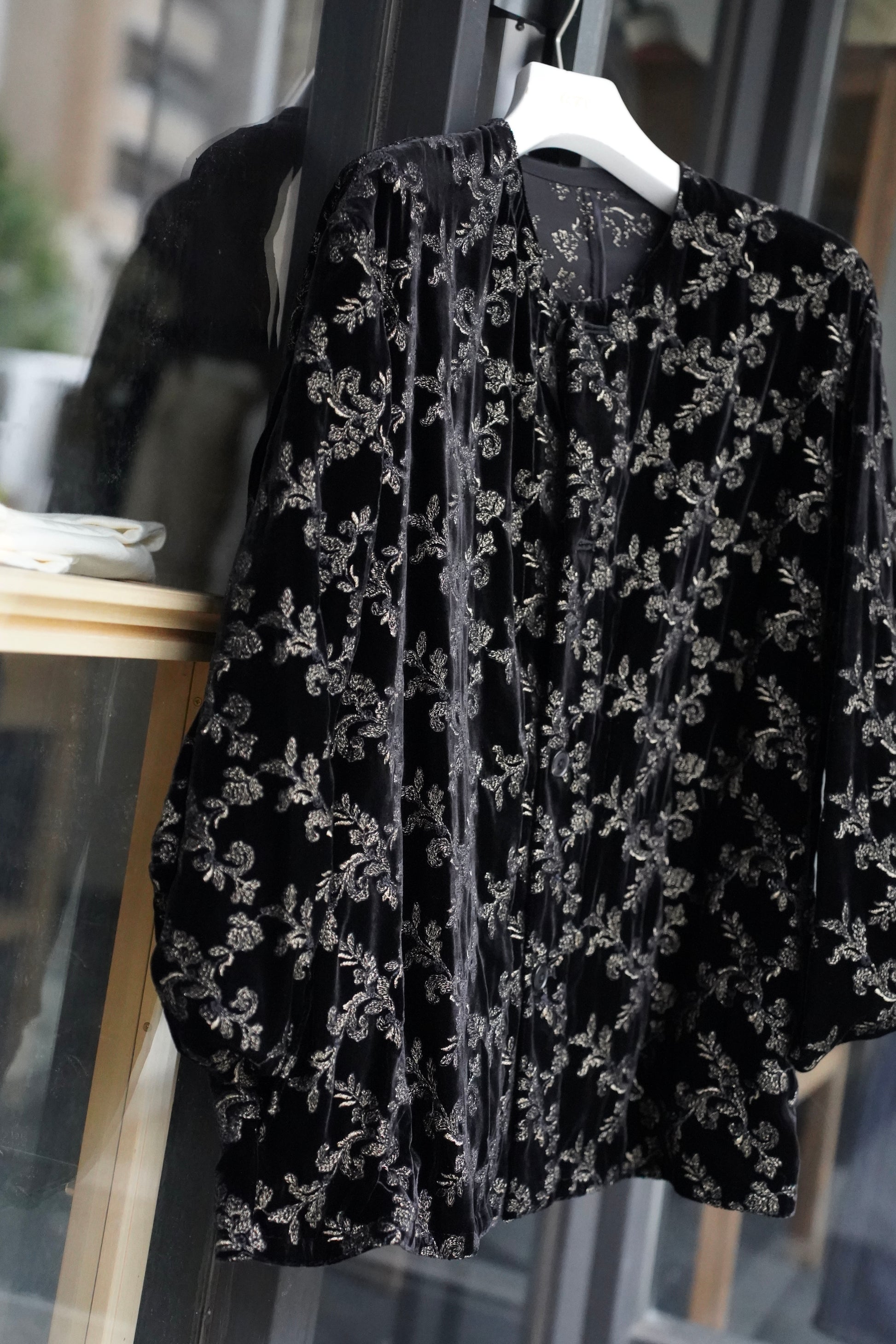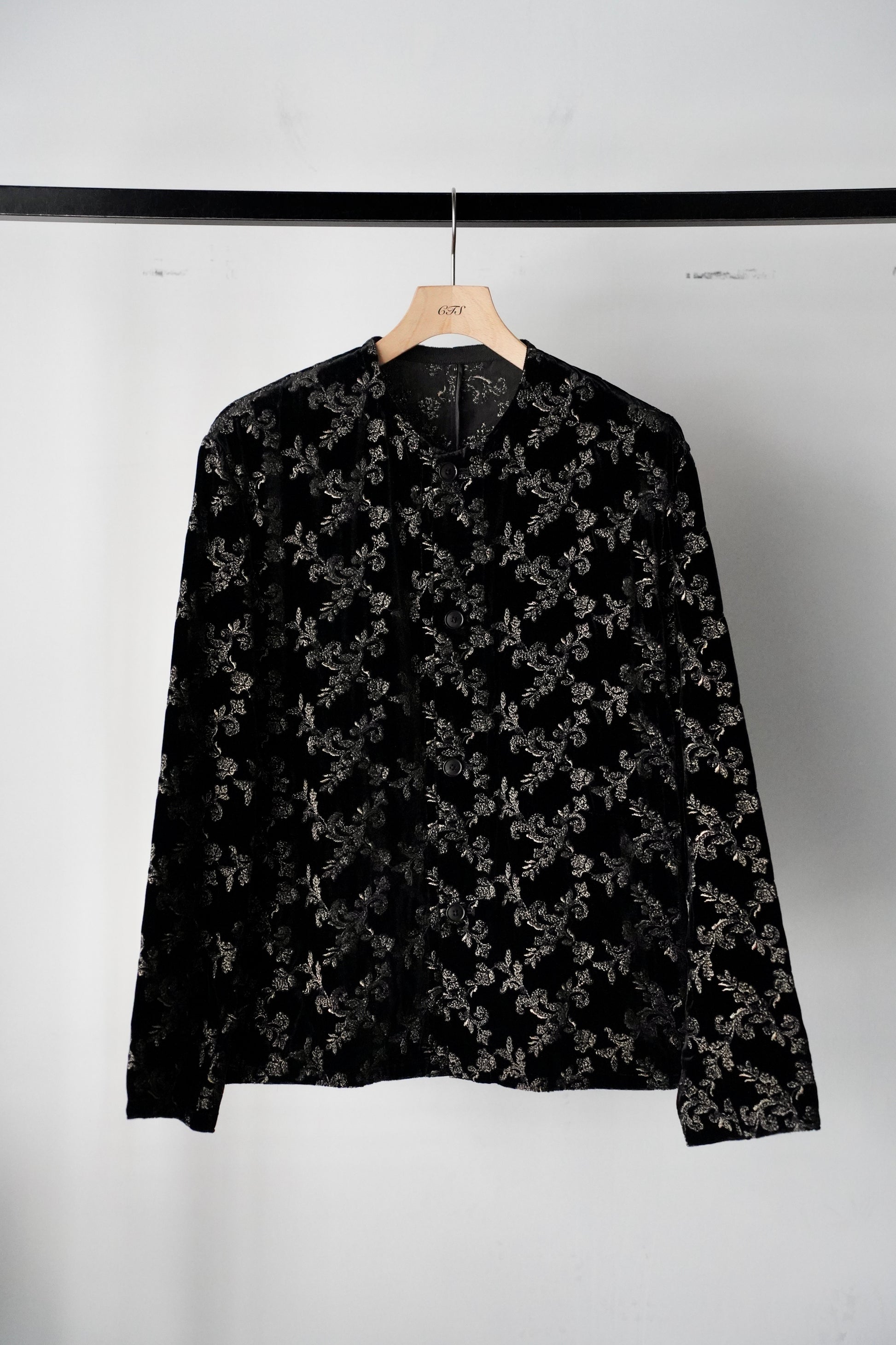 フランスの伝統的な刺繍ファブリックメーカーにオリジナルで別注し作り込んだ素材を使用。軍物のライナーをベースに作り込んだノーカラーブルゾンを作成。