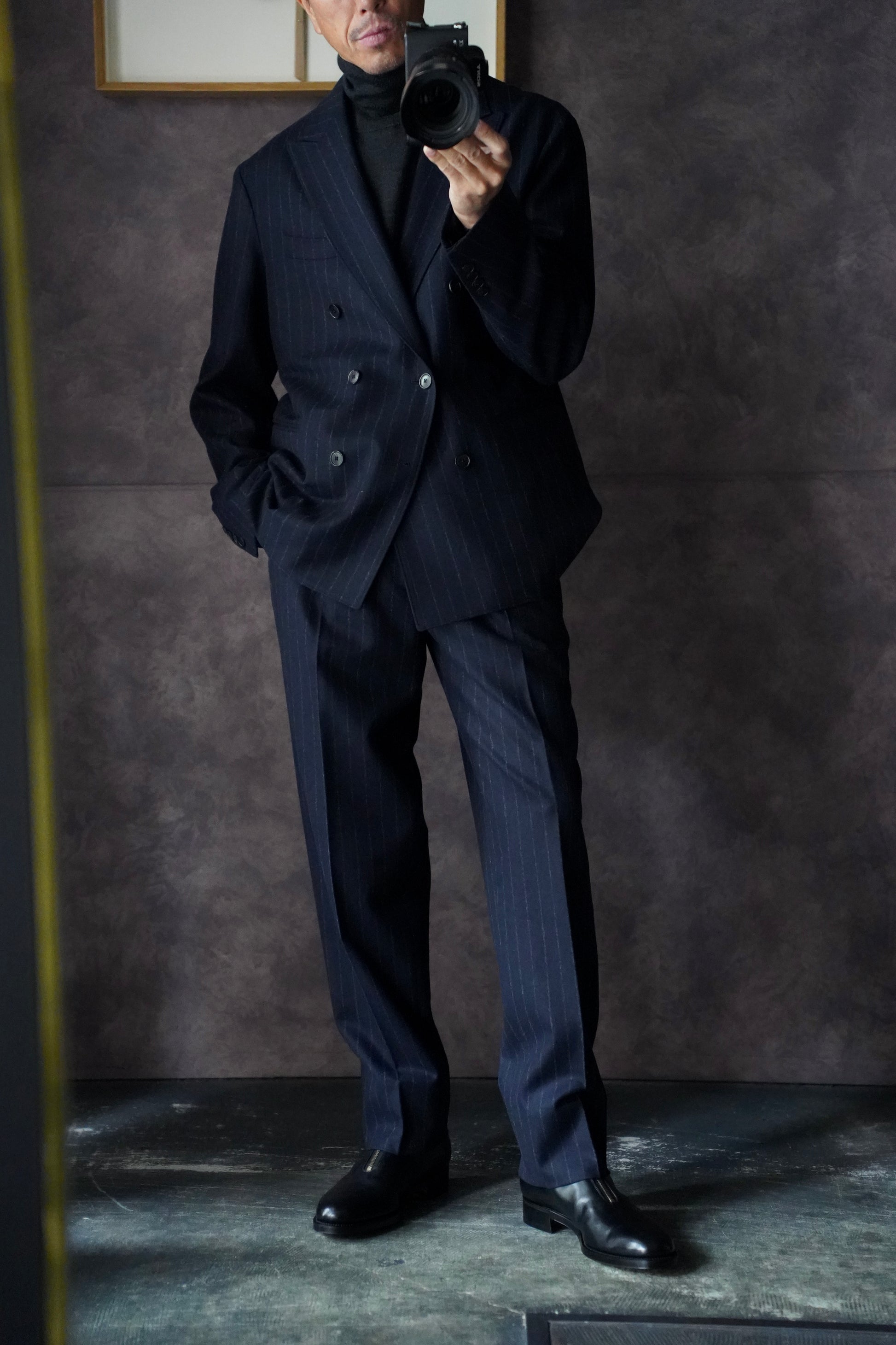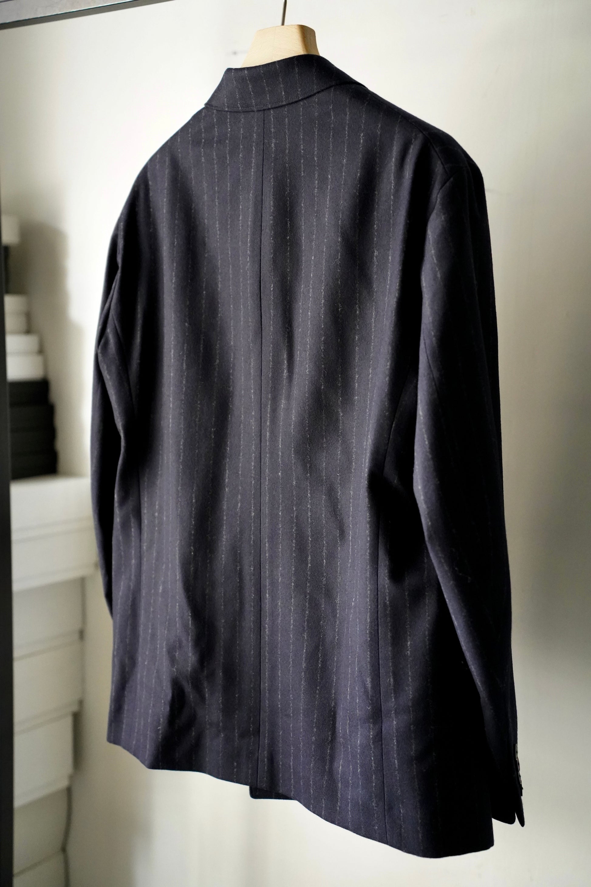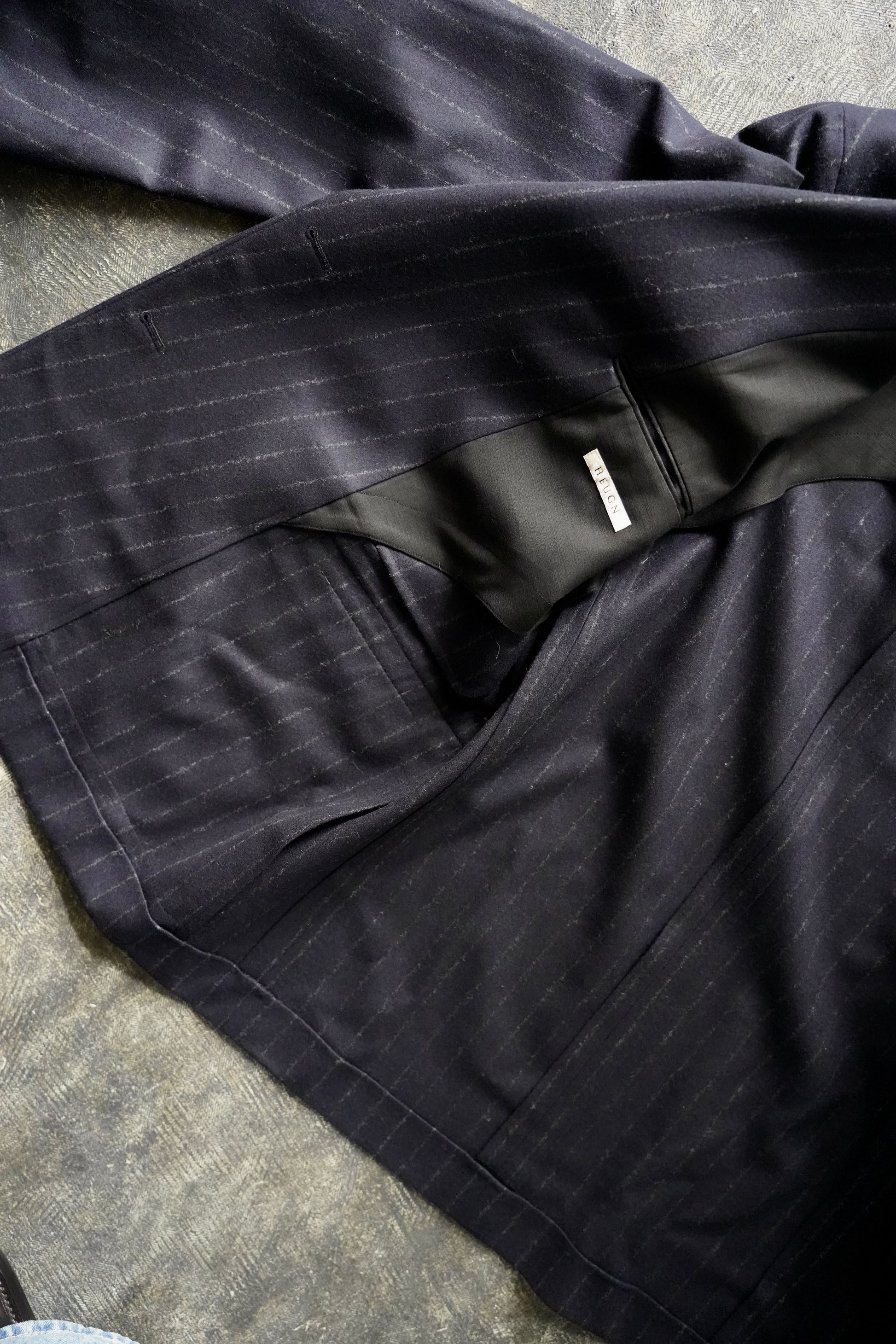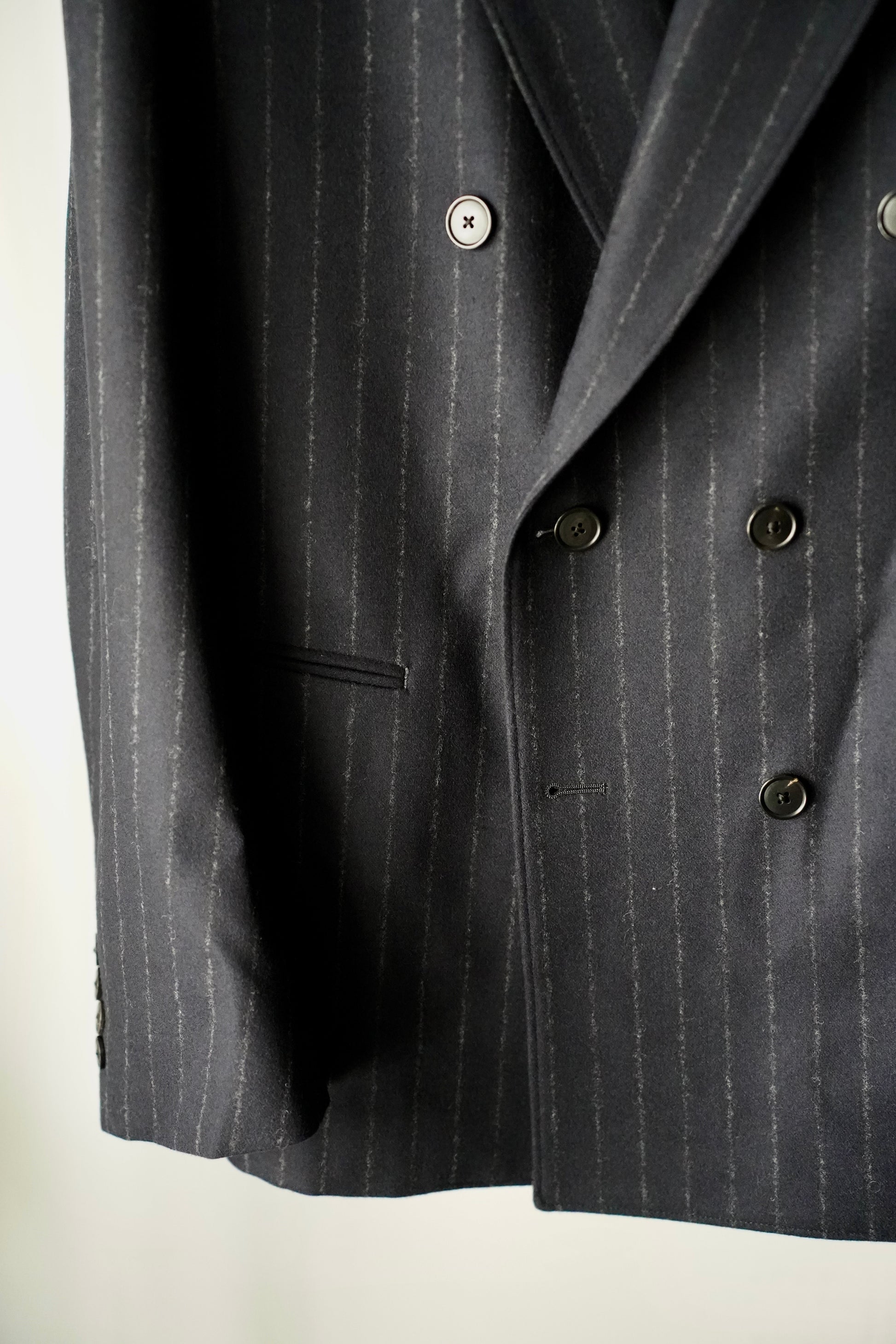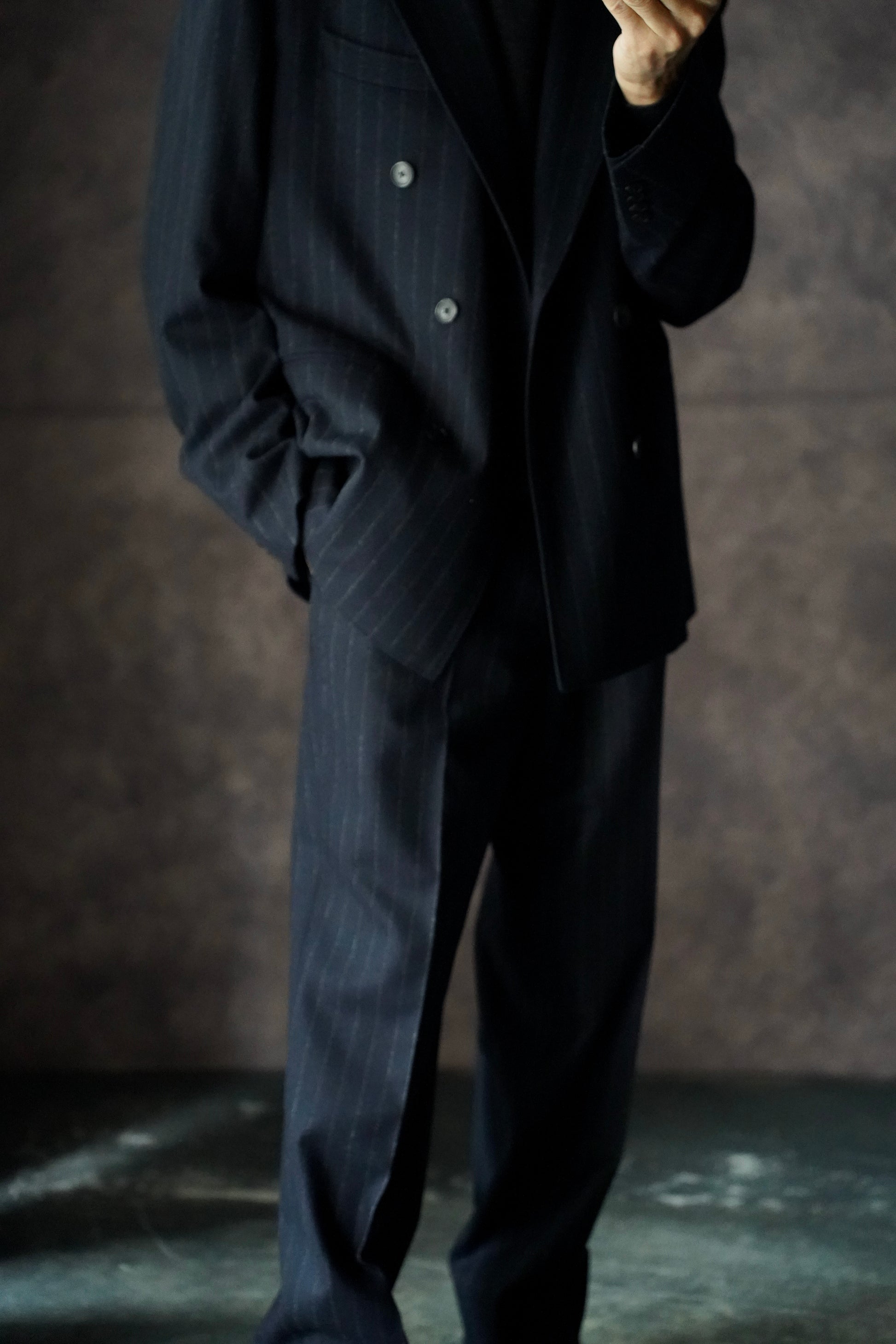 イギリスのSavile clifford生地。チョークストライプのスーツ生地を使用。1940年代のワークジャケットをベースにダブルブレストのジャケットに仕上げました。