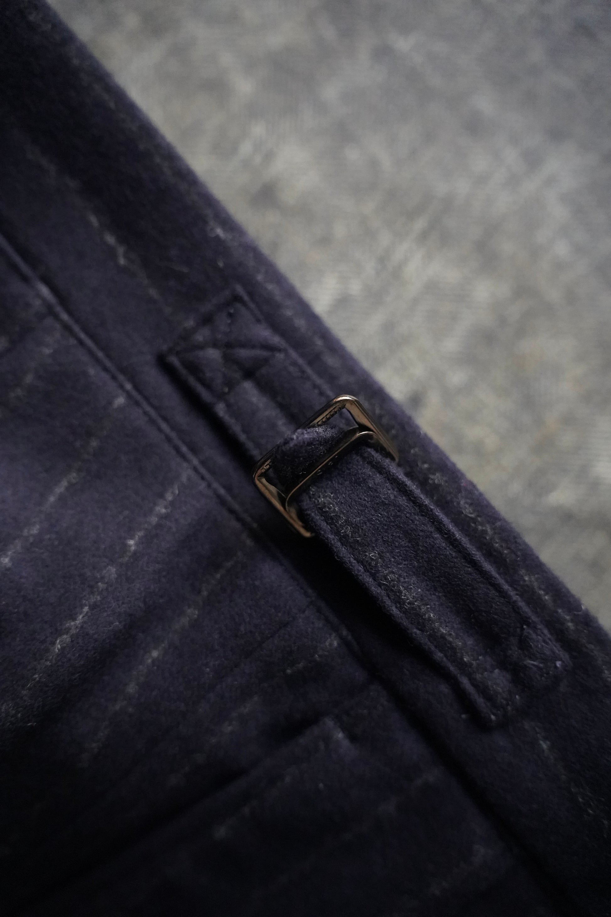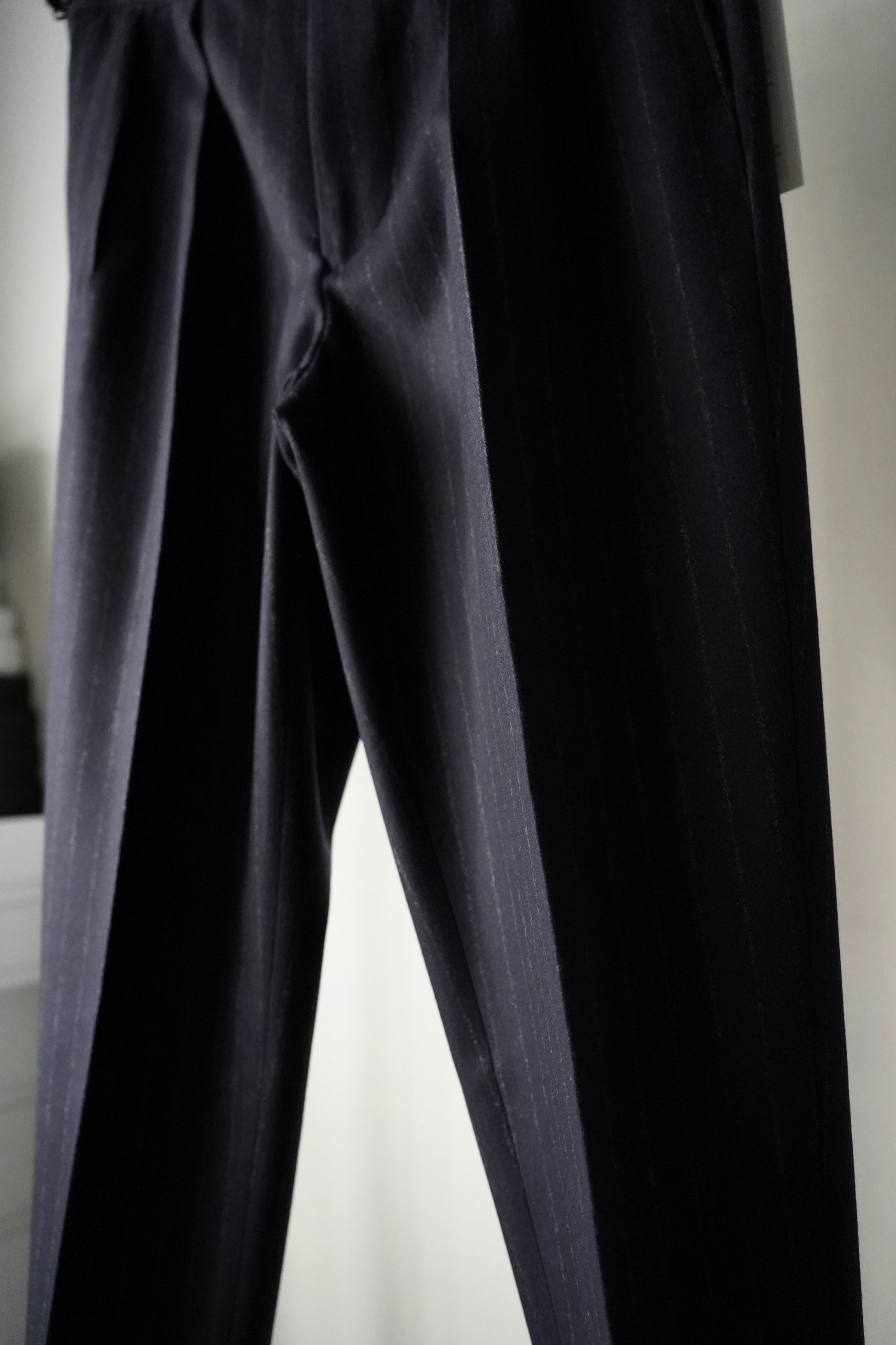イギリスのSavile clifford生地。チョークストライプのスーツ生地を使用。フランスのフォーマルドレスパンツををベースにサイドアジャストの美しいシルエットのNEWモデル Aaron