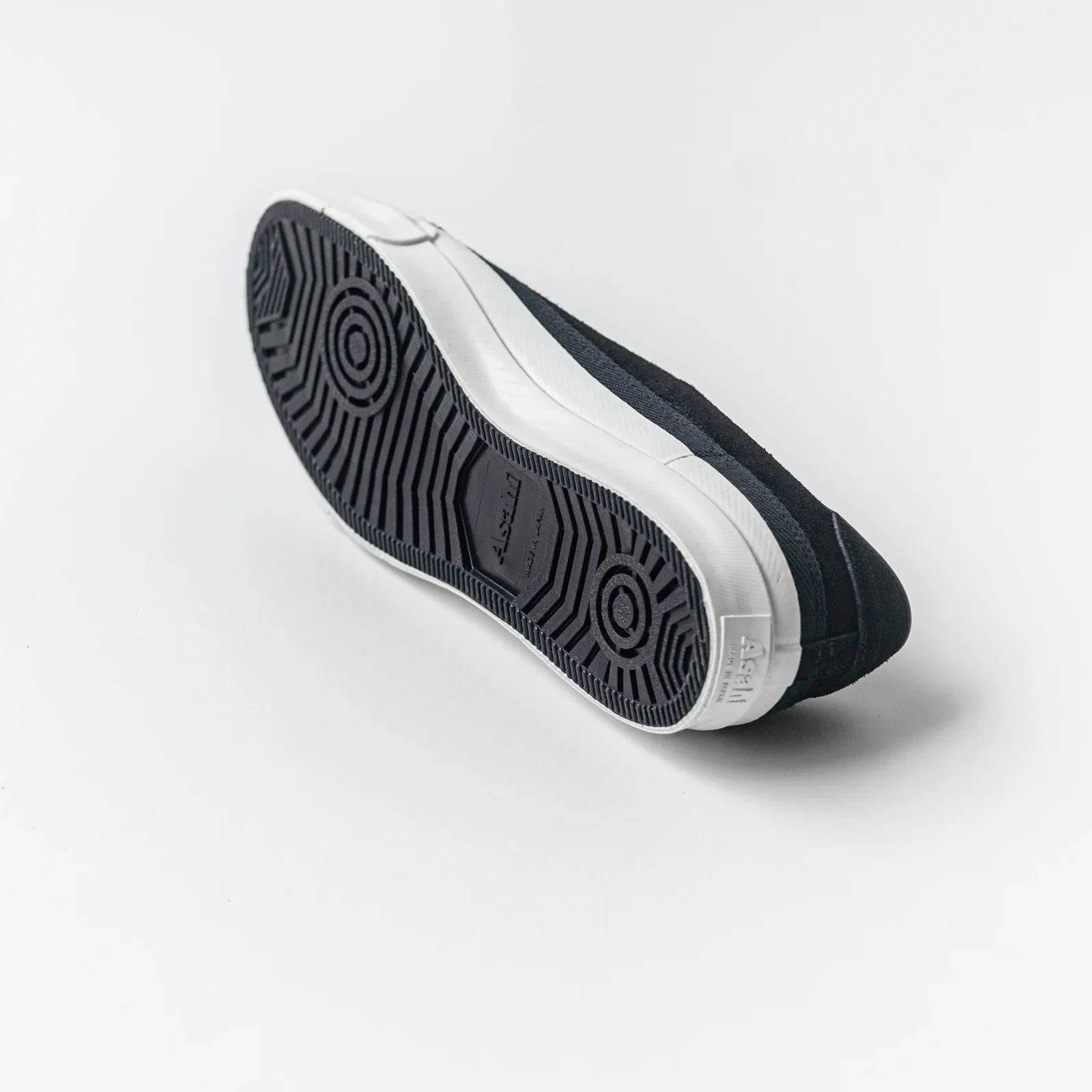 In the 1970’s, applying leather uppers using a vulcanizing method with the technical skills at that time was not ideal since the adherence to rubber was poor and it was lacking in durability. In the technique invented to solve the problem, to wrap a cotton herringbone tape like a belt before the bonding process, we found creativity and durability once again. Slip-on with asymmetrical design, suede upper, and belted construction.