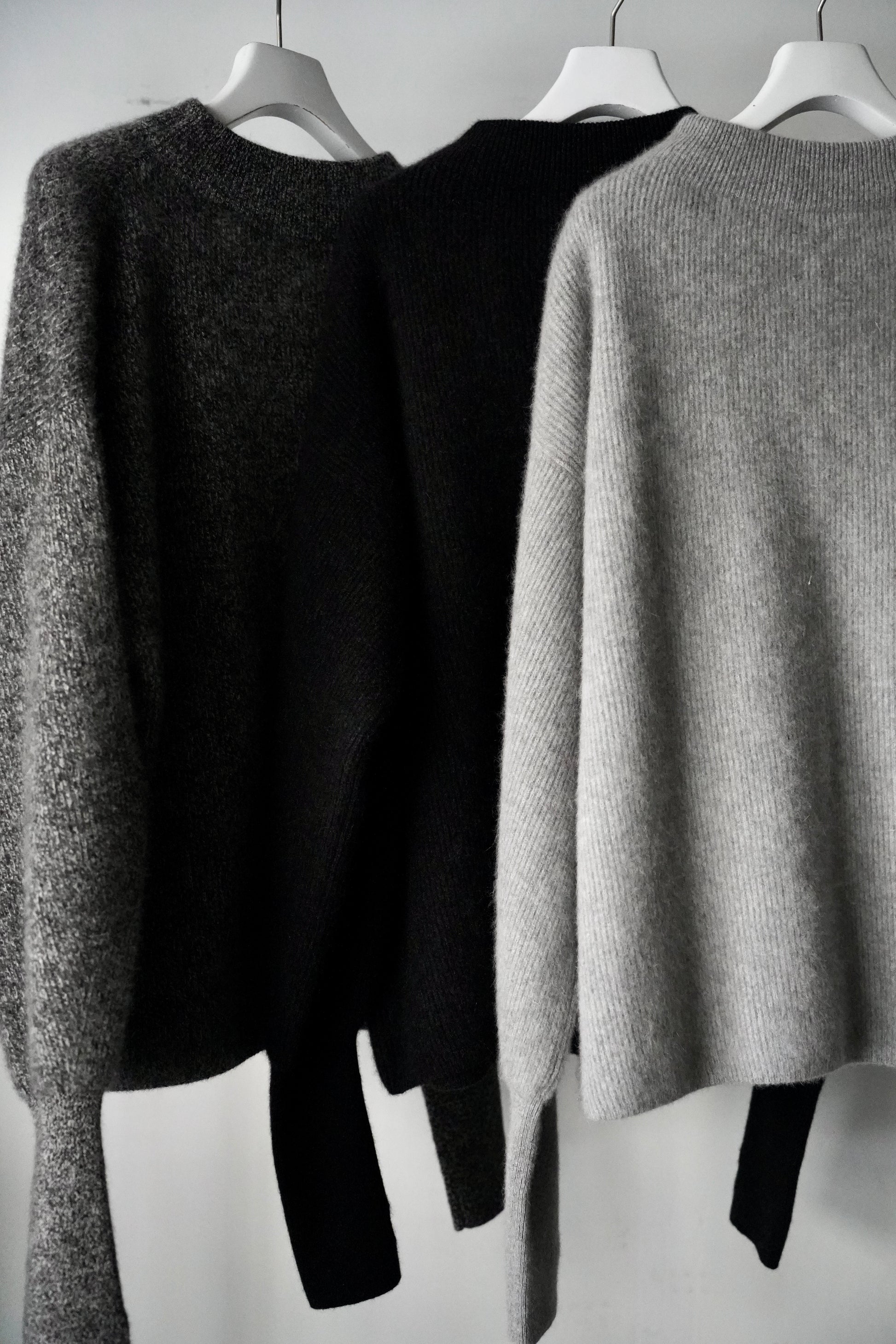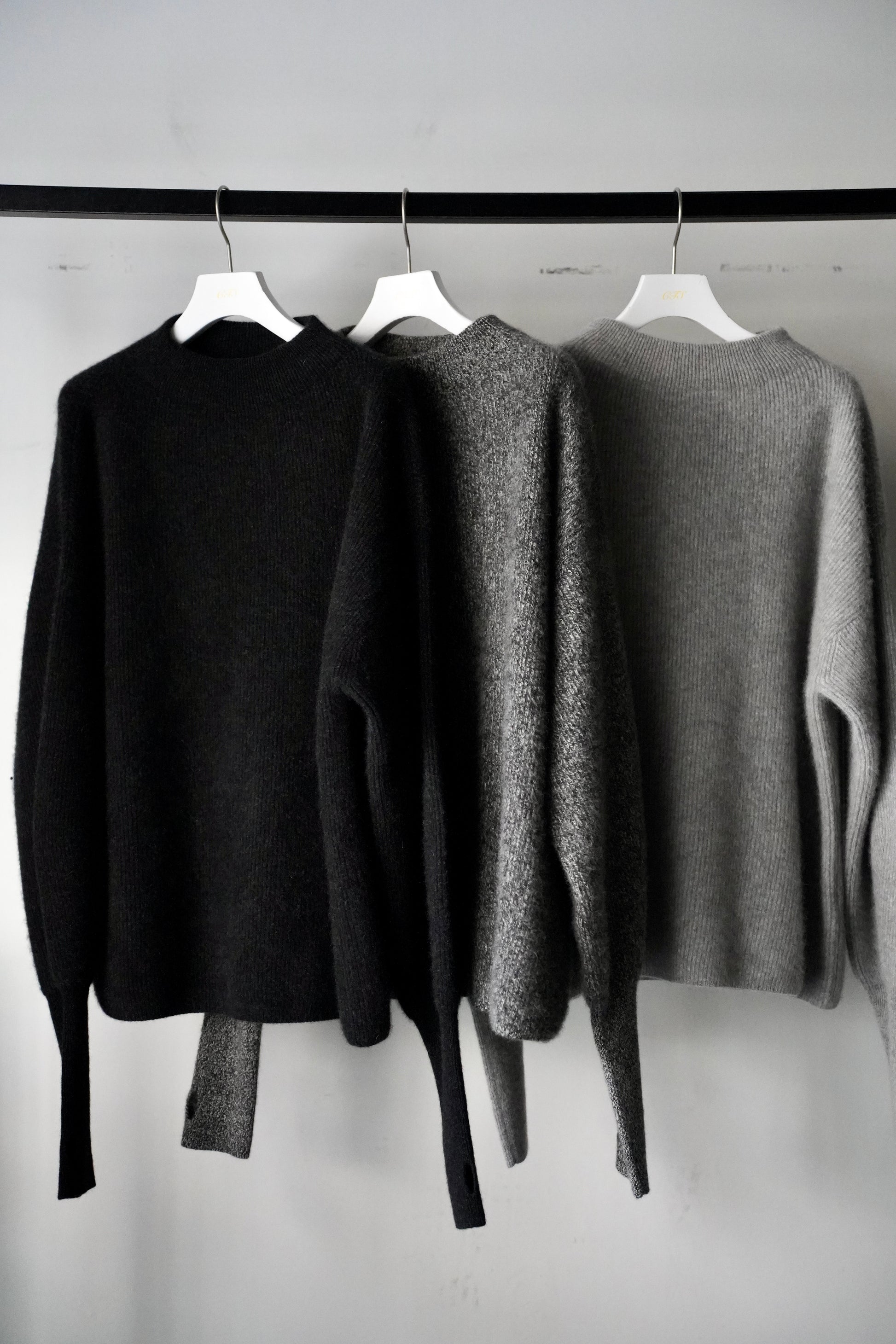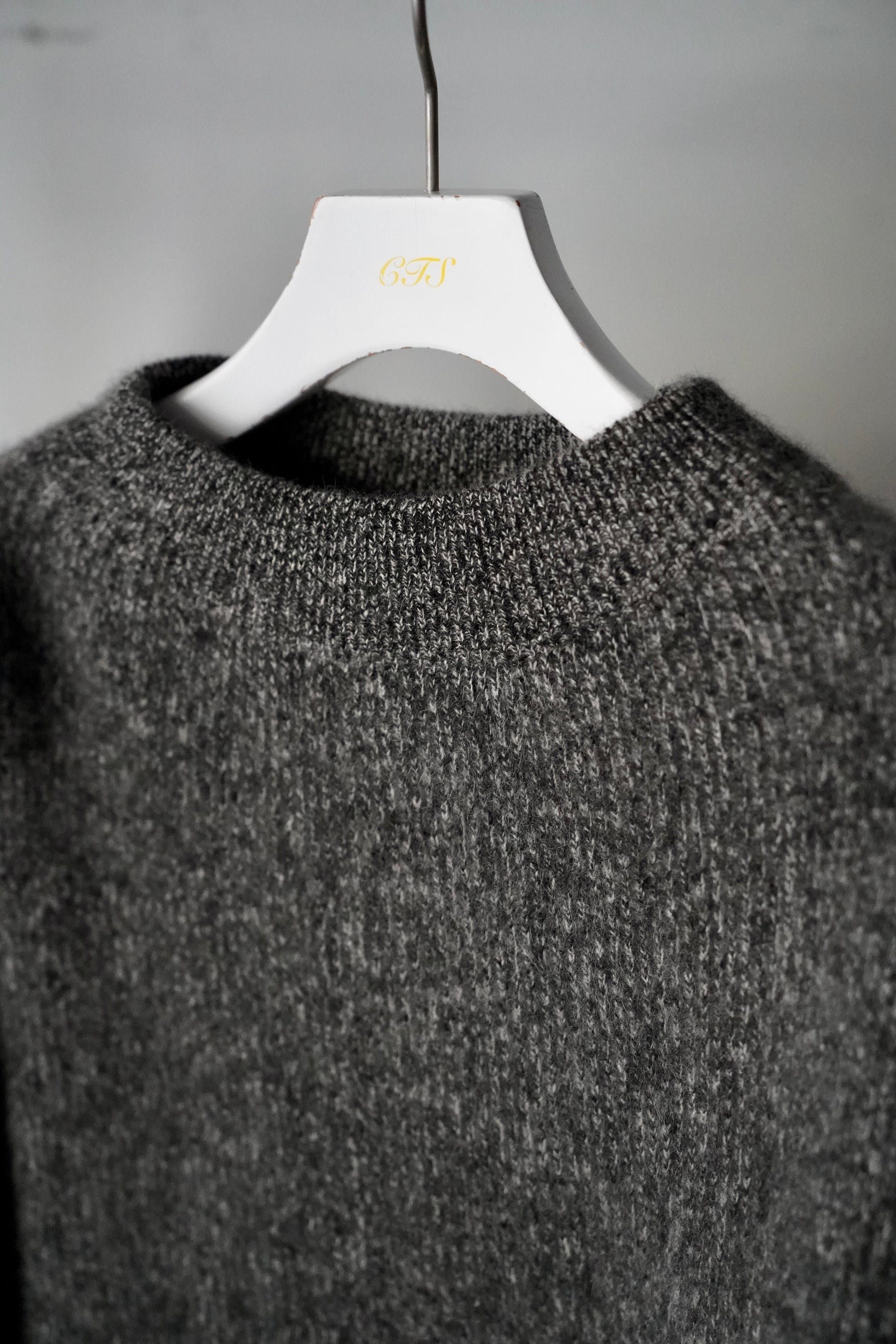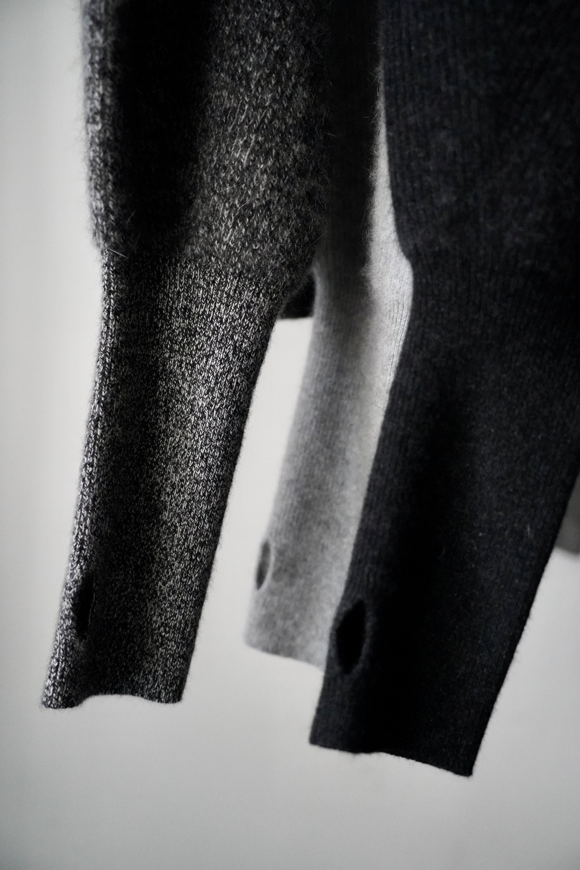 ほんのり青みがかった淡いグレーのブルーフォックスと、カシミヤの主要産地の一つとして知られるアルランシャン産の、ふくらみ豊かなカシミヤを使用。これらを、相互の特徴を最大限に引き出す3:1の黄金比でブレンドし、丁寧に紡績しました。この素材ならではの、上質な起毛感、軽やかさ、そして滑らかな肌触りが特徴の商品。袖丈は長めで袖は折り返しても着用可能。